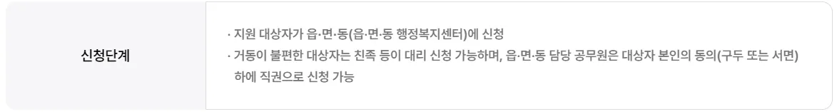 독거노인생활관리사, 장애인활동보조인, 요양보호사, 자원봉사자 등 관련자들의 협조를 얻어 읍면동에서 신청하실 수 있습니다.