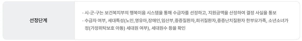 ✔ 지원대상 : 국민생활기초 보장법상 생계·의료·주거·교육급여 수급세대 중 노인, 영유아, 장애인, 임산부, 중증·희귀·중증난치질환자, 한부모가족, 소년소녀가정(가정위탁보호 아동 포함)이 있는 세대
